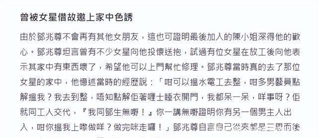 他说:“我不缺钱,犯不着为了钱委屈自己。” 比起被男富豪包养的邀约,邓兆尊被女星诱惑的经历更有画面感。
